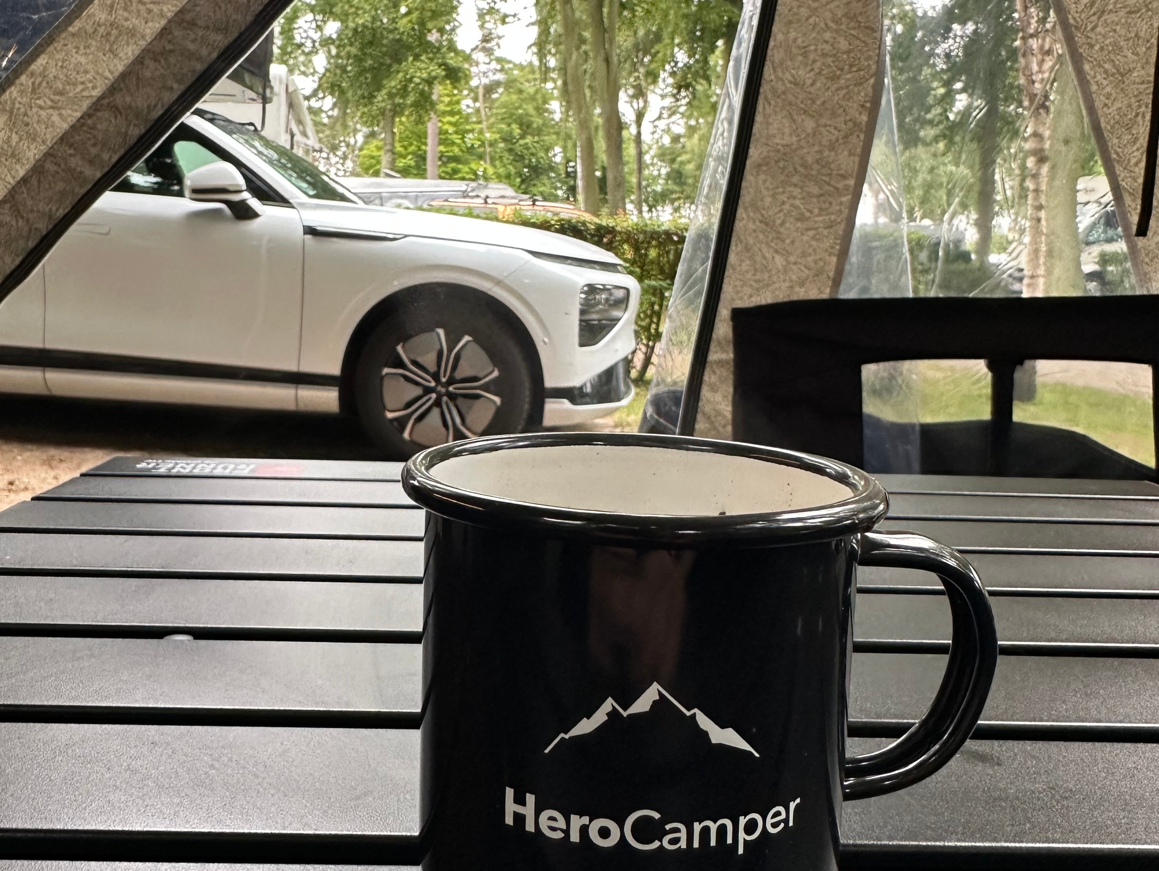 Denne sommer pakkede vi en HeroCamper og tog på tur, hele familien, hunden med en 2024 Xpeng G9 Standard Range som trækkraft. Vogntoget bestod af en HeroCamper med en række optimeringer for at holde vægten nede og aerodynamikken oppe. Roofrack, stige og reservehjul blev hjemme, og i stedet fik monterede vi en ekstra let køkkendør. Kabine og køkken forblev, som man kender det: Simpelt, funktionelt og klar til eventyr. På Xpeng G9’eren monterede vi et HeroCamper Galileo tagtelt.