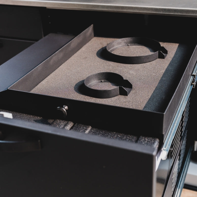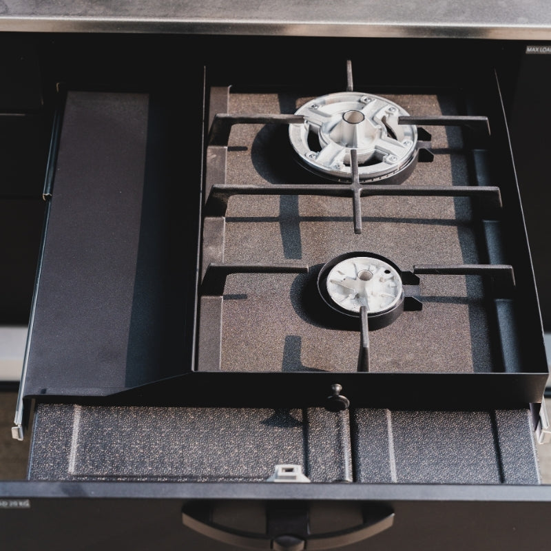 Die integrierte Schublade verfügt über eine eingebaute Halterung die lose Komponenten des Gaskochfelds wie Brenner und Topfträger sicher fixiert und Klappern sowie Beschädigungen während der Fahrt verhindert. So bleibt alles ordentlich verstaut und jederzeit leicht zugänglich wenn es Zeit zum Kochen ist.