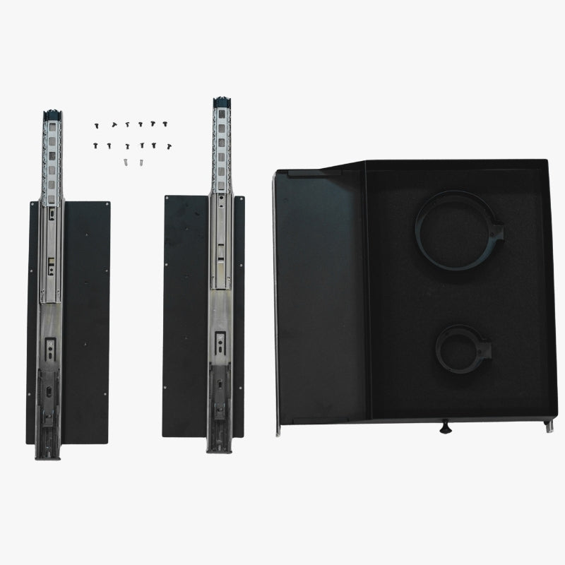 Wenn Ihr Setup kein Gaskochfeld beinhaltet lassen sich die Halterungen einfach entfernen. Dadurch wird die integrierte Schublade zu zusätzlichem praktischem Stauraum für Küchenutensilien Lebensmittel oder andere wichtige Campingutensilien.